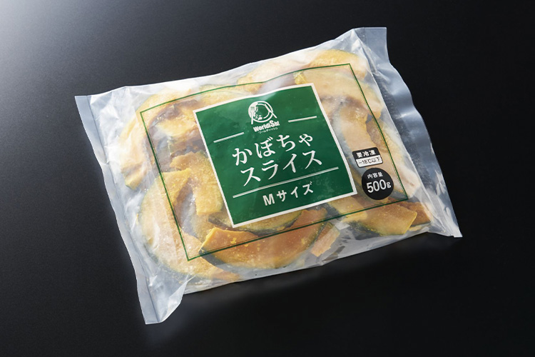 固くて切りづらいかぼちゃをスライスして、急速凍結しています。天ぷらなどにご使用いただけます。