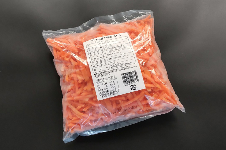 人参を千切りにし、軽く湯通しした後、急速冷凍しました。人参本来の美味しさをお楽しみください。